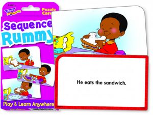 Once a student can verbalize sequencing cards, have the student act out sequences and say the steps in vivo.